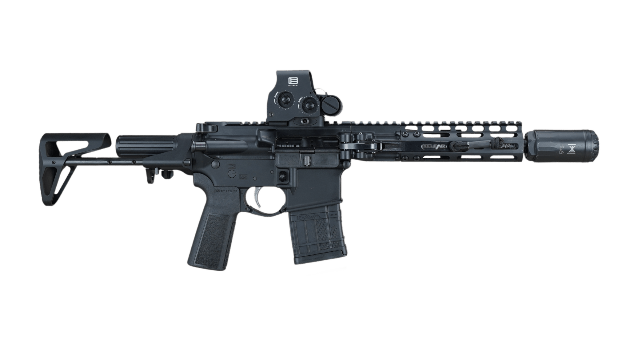 - 10.5″ – As the newest addition to our barrel lengths, the 10.5″ barrel matches nicely with a standard carbine stock or pistol brace and compact suppressor, also allowing the weapon system to fold in half, under 15″ overall length.